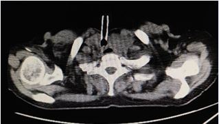 Figure 2 Neck CT demonstrates significant post-treatment reduction in the left thyroid lobe mass, which no longer causes significant compression or obstruction of the cervical trachea. A tracheostomy has been performed.