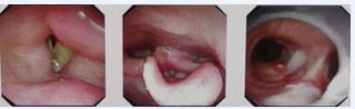 Figure 3 Laryngoscopy reveals left vocal cord paralysis with normal right vocal cord mobility and no significant tracheal stenosis.