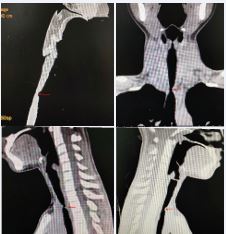 Examination: Physical examination revealed inspiratory dyspnea with mild sternal retractions. Laryngoscopy revealed a 4 mm scar-induced tracheal stricture. Normal vocal cord mobility (Figure 4). Neck CT confirmed a 1.5 cm tracheal stenosis with a 4 mm narrowest diameter (Figure 5).