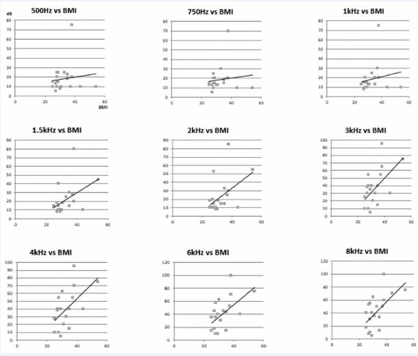 Figure 2 Graphs of correlation between audiometric frequencies and BMI, in succession from low to high frequencies.