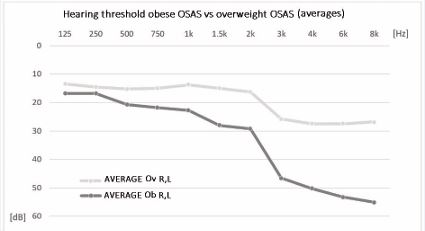 Statistically significant differences were found in the comparison of the thresholds hearing loss between obese OSAS patients and overweight OSAS patients also (Table 2, Figure 2).