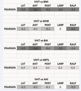 Table 6 Correlation data, expressed by Pearson’s r index, between the VOR gains obtained by the V-HIT and the other variables identified (BMI, WHR, BAI, METs, AHI).