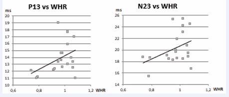 Figure 4 Correlation between the severity of obesity and the alterations found in the C-VEMPS traces. The blue dots represent the values of P13 and N23 found on the C-VEMPS traces and correlated to the WHR value that was quantified for each patient on the basis of the polysomnographic report. The trend line is shown in black, witnessing the 0.4 obtained with the calculation of the Pearson index which confirms the association between the delay in the appearance of the potential and the WHR index.