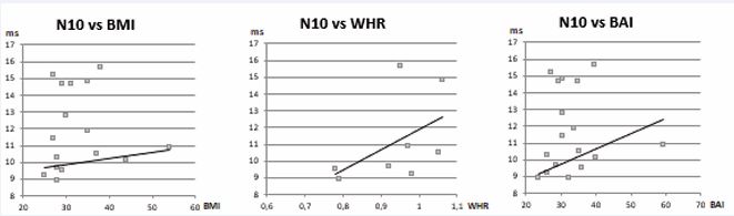 Figure 5 Correlation between the alterations found in the O-VEMPs traces and morphometric indices. The blue dots represent the N10 values correlated with BMI, WHR and BAI. The straight line highlights a general correlation between the delay of N10 and a higher value of BMI, WHR and BAI.