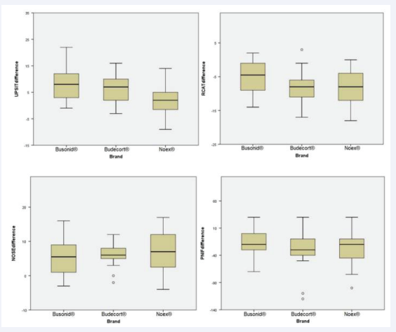 Figure 1: Boxplot graph comparing the means of pre- and post-treatment differences among 3 brands of nasal budesonide (Busonid®, Budecort® and Noex®), when University of Pennsylvania Smell Identification Test (UPSIT®), Rhinitis Control Assesment Test (RCAT), Nasal Obtruction Symptom Rating Scale (NOSE) and Peak Nasal Inspiratory Flow (PNIF) tests were evaluated by ANOVA, in intention-to-treat (ITT) data analysis