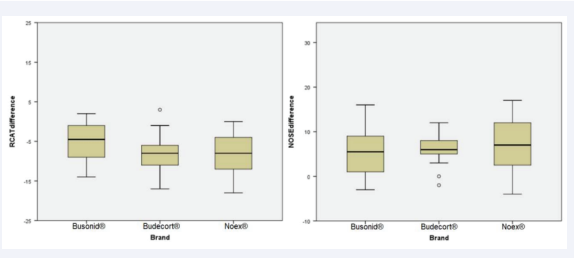 Figure 2: Boxplot graph comparing the means of pre- and post-treatment differences among 3 brands of nasal budesonide (Busonid®, Budecort® and Noex®), when Rhinitis Control Assesment Test (RCAT) and Nasal Obtruction Symptom Rating Scale (NOSE) tests were evaluated by ANOVA, in per-protocol (PP) data analysis