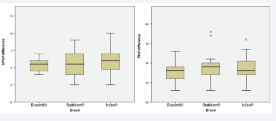Figure 3: Boxplot graph comparing the means of pre- and post-treatment differences among 3 brands of nasal budesonide (Busonid®, Budecort® and Noex®), when University of Pennsylvania Smell Identification Test (UPSIT®) and (Peak Nasal Inspiratory Flow) PNIF tests were evaluated by Kruskal-Wallis, in per-protocol (PP) data analysis.