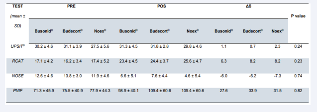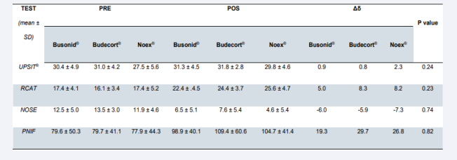 Results: Nineteen patients received Budecort Acqua®, 19 Busonid®, and 19 Noex®. Of the 57 randomized patients, 50 returned for data collection after 4 weeks of treatment. The number of dropouts was not statistically significant among the groups (p=0.13). All tests UPSIT®, PNIF, NOSE, and RCAT, significantly improved after 4 weeks of intervention in the three groups studied (p<0.01). None of the tests showed a statistically significant difference when compared among the groups, both pre- and post-treatment values, in both ITT and PP data analyses, UPSIT® (p=0.24 and p=0.26), PNIF (p=0.83 and p=0.79), NOSE (p=0.74 and p=0.58) and RCAT (p=0.23 and p=0.14). No serious adverse effects were reported in any of the three groups analyzed by the present study.