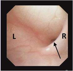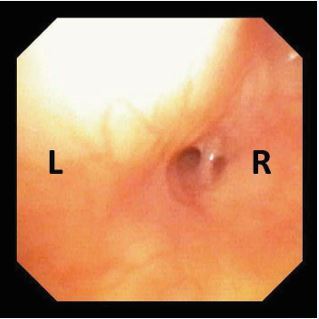 Figure 7 Flexible endoscopy demonstrating a double-lumen opening in the left pyriform sinus.