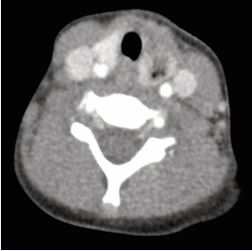 A 5-year-old boy presented with left-sided neck swelling. CT demonstrated a hypodense focus in the left thyroid lobe, with air bubbles adjacent to the pyriform sinus (Figure 3).