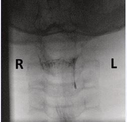 An 11-year-old boy presented with a tender swelling on the left side of the neck at the level of the thyroid. Magnetic resonance imaging (MRI) demonstrated a small effusion within the thyroid gland and an abnormality in the left pyriform sinus. A subsequent barium swallow showed a contrast-filled tract extending 1.6 cm from the apex of the left pyriform sinus (Figure 4). Flexible endoscopy confirmed the internal opening, which was successfully cauterized under general anesthesia.