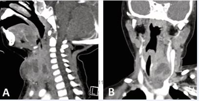 Figure 6 (A) Sagittal CT showing inflammation and edema involving the subcutaneous fat of the anterior neck. (B) Coronal CT showing compression of the left jugular vein and rightward tracheal deviation.