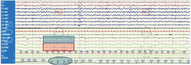 Figure 1 Example of glottic closure noted on polysomnography with titration of noninvasive ventilation. This is a 60 second epoch from a polysomnogram for a 52-year-old woman with progressive bulbar weakness secondary to amyotrophic lateral sclerosis. Evident are the machine-delivered breathes (blue box) based on timing of delivery with no significant abdominal or thoracic excursion (red box) and a loss of exhaled tidal volume (circled). Note there is no significant detectable desaturation during these transient events.