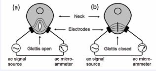 Figure 1: A schematic of the electroglottograph. A high-frequency ac signal, typically 200 kHz, is applying on one side of the neck. An ac microammeter is placed on the other side of the neck. (a), when the glottis is open, the ac current is reduced. (b), when the glottis is closed, the ac current is increased.