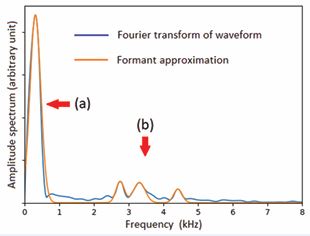 As shown, there are four prominent peaks in the spectrum. From each peak, there are three parameters: the frequency, the amplitude, and the curvature. They provide information of the three parameters for each formant: central frequency Fn , amplitude Cn , and bandwidth Bn .The algorithm of finding those formant parameters are described in Ref [11]. The parameters of the formats are shown in Table 1.. As shown, there is a strong formant of a low frequency, 315 Hz, shown as (a), and three weaker formants at higher frequencies between 2.5 kHz and 5 kHz, shown as (b). The ARCTIC database was collected in the 1990s. The sample rate was 32 kHz, and the signal quality was not great [12]. The formant parameters for five cardinal vowels and an unvoiced consonant [m] in this article were extracted from a modern recording with sample rate of 44.1 kHz [13]. See Tables 2-7. For example, the bandwidths of the formants in Table 4 are smaller than those in Table 1, indicating a better clarity.