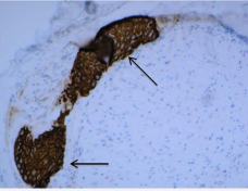 Figure 2: Case 2. Perineural invasion of the infraorbital nerve visualized by immunohistochemical staining for Cytokeratin 5. Arrows indicate the squamous cell carcinoma. Original magnification x 200.