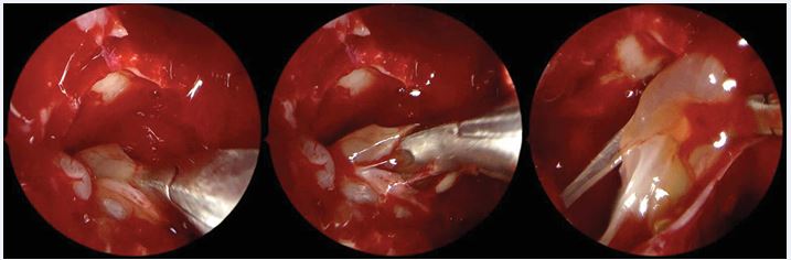 Figure 2 Reboot surgery approach. Image sequence showing the antrum grasping forceps (Heuwieser) removing polypoid mucosa from the entire right maxillary sinus.