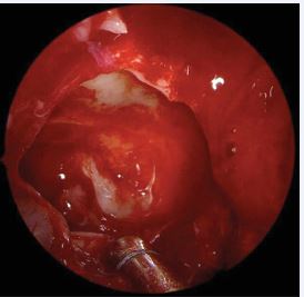 Next, the diseased mucosa of the anterior and posterior ethmoids must be removed, including lamina papyracea, skull base, and lateral face (and anterior portion, when necessary) of the middle turbinate (Figure 4).
