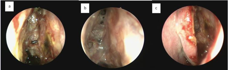 Figure 6 Postoperative period of Reboot surgery at 2 weeks: return of nasal mucosa in the ethmoid sinus in 3 different patients. A) Left nasal cavity, reepithelization process; B) Left fronto-ethmoidal region, visualization of the frontal recess with adequate opening; C) Left nasal cavity, no signs of nasal synechia.
