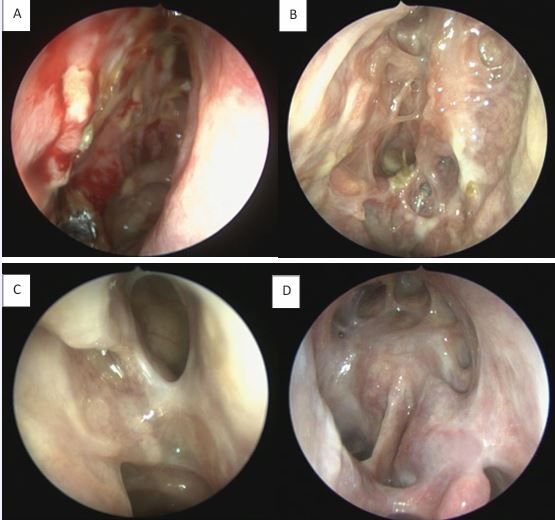 Figure 7 Postoperative follow-up after Reboot surgery. A) Right nasal cavity, 14 days; B) Right nasal cavity, 30 days; C) Left nasal cavity, 90 days; D) Left nasal cavity, DRAF III, 24 months.