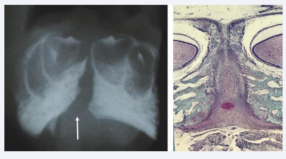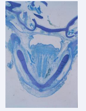 Figure 7: Left: Frontal radiograph of the mental region in a human fetus19 weeks of Gestation. The radiograph taken with a bone sensitive x-ray machine demonstrates the Symphysis Menti (arrow) and bony alveolae for the primary incisors, where dentine and enamel formation have started. Right: Frontal histological section of the specimen demonstrated in the left figure. The broad Symphysis menti is registered, richly vascularized, and bordered by bilateral bone tissue with tooth buds located in alveoli.