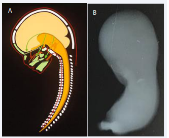 Figure 2 A: Schematic drawing of the human body axis demonstrating the origin of the vertebral column (illustrated by red marking of the notochord in the corpora of the vertebrae) and the green craniofacial bones, originating from the dark yellow neural tube. From the neural crest of the neural tube the multipotent cells migrate anteriorly to form the craniofacial skeleton as demonstrated by green arrows. Note that cells from different sites on the neural tube migrates to different bony regions. B: Illustration of a whole-body radiograph from a human fetus,7 weeks of Gestation. The radiograph has been taken in a specific bone- sensitive X-ray machine The right arrow indicates ossification of the clavicular bone, which is the first bone in the human body to ossify. The left arrow marks the region in which the mandible starts ossification, shortly after start of ossification in the clavicula.