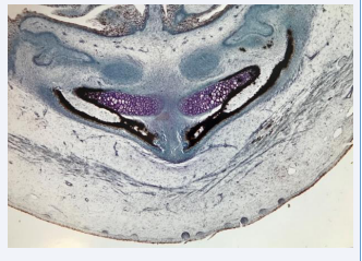Figure 3: Horizontal histological section of a human mandible, Gestational age 9 weeks. The bony components are black due to silver impregnation. The arrow marks the symphysis menti region in the mid-axis of the body. The rostral parts of the purple Meckel’s cartilage are undergoing ossification. Immature tooth buds are observed in the upper part of the figure.