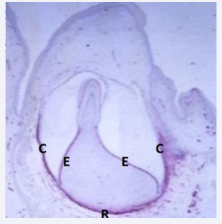 Figure 4: Illustration of an early stage in development of a primary tooth. C marks the crown follicle and R the root membrane. E marks the inner enamel epithelium and the red color indicates reactions for peripheral nerves ( NGFR, Nerne Growth Factor Receptor reaction) Dentine and enamel are not clearly registered at this stage.