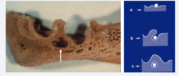 Figure 6: Left: Eviscerated human fetal mandible, age 15 weeks of Gestation. The arrow marks the mental foramen between the open alveolar structures where the primary canine and first primary molar were formed. Right: Three drawings demonstrating how the mental foramen was formed by bone encircling the peripheral nerve (round white structure) from stage a to c.