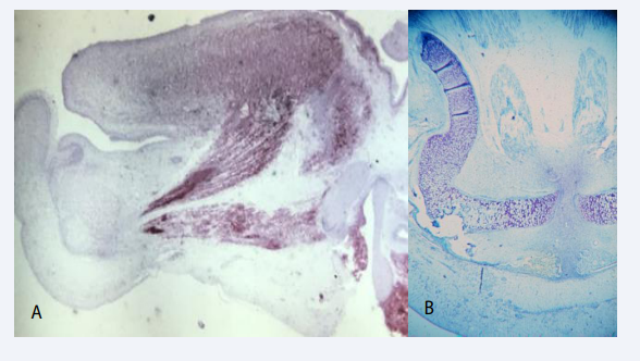Figure 8 A: Mid-sagittal section through the tongue in a human fetus 12 weeks of Gestation. The red color express NGFR ( Nerve growth Factor Receptor) indicating muscle activity. Two muscle bundles appear active. The upper is the genioglossus muscle and the lower the geniohyoid muscle. Contraction of these two muscles results in a backward and downward move of the tongue and mandible. These physiological processes are responsible for creating space for the maxillary shelves to elevate and fuse during palate formation. B: Histological horizontal section of the mandible, Gestational age 13 weeks, demonstrating the S-shape of the Mekel’s cartilage, which is a result of the backward drawing of the mandible by muscular traction (see figure A).