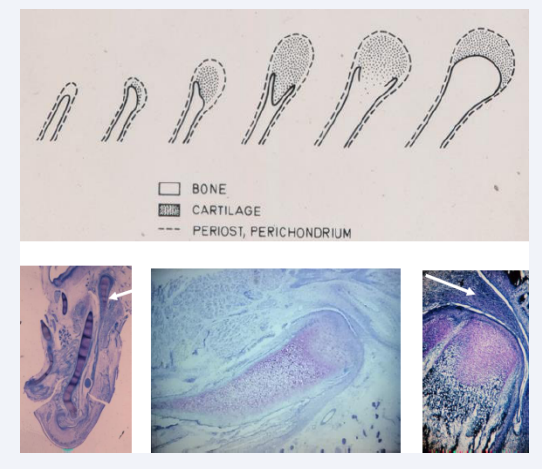Figure 9: In the upper part of this figure drawings indicate steps in development of the mandibular condyle. In the lower part three histological sections in different slanting planes illustrate the location and morphology of the mandibular condyle from gestational age 15-20 weeks. Lower left figure demonstrates that the condyle (white arrow) develops laterally compared to the Mekel’s cartilage. In the center a vertical section demonstrates the length of the condylar cartilage before resorption starts. This figure also demonstrates development of the lower cavity in the jaw joint and the early formation of the discus. The right section in the lower part of the figure demonstrates a canal in the condylar cartilage and a fully developed joint cavity with a discus marked with a white arrow
