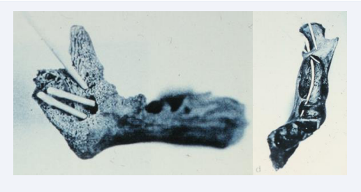 Figure 10: Two human anthropological mandibles from about 30 weeks of Gestation illustrate the initial formation of the alveolar inferior nerve and the mandibular canal. Left mandible is observed from the lingual side with gutta-percha points ( root filling sticks) resembling peripheral nerves inserted in different holes. Right mandible observed from above. In this figure the gutta-percha points indicate that the peripheral nerves have different directions and are located in different levels.