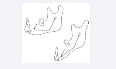 The mandibular canal has a straight morphology at birth. Later in childhood the canal appears curved. This curvature seems comparable to the outer jaw morphology, expressed as the angle formed by the posterior contour of the mandibular ramus and the line marking the lower contour of the corpus mandibulae [Figure 13] [21].