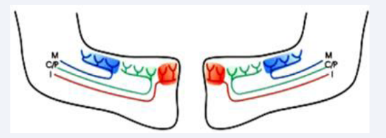 Figure 16: Schematic drawings of the left and right half part of the mandibular bone. Inserted in colors are the innervation to the incisors, I (red) to the canine, premolars C/P (green) and molars M (blue)