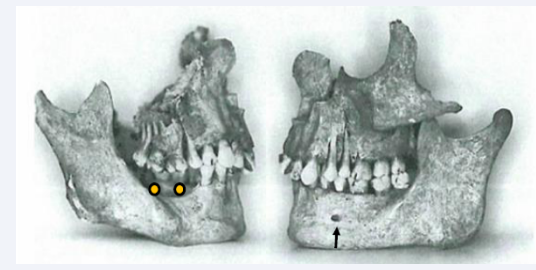Figure 17: Right and left sides of the maxilla and mandible from the same anthropological case. The arrow marks presence of the mental foramen in the left side, while the mental foramen is absent in the right side where also agenesis of the premolars occurs (yellow dots).