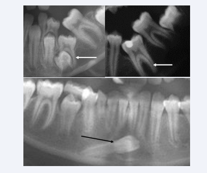 Arrested eruption occur in the primary and permanent dentitions. The etiology behind is often anchylosis-but why anchyloses has developed is not known [33-38]. Ankylotic conditions of a primary molar and of a permanent molar are demonstrated in Figure 20A.