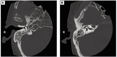 Figure 1 The computed tomography scan of the patient. (A) The bone destruction formed a sinus (the arrow) from the anteroinferior wall of EAC to the mandibular fossa. (B) Inflammatory tissue filled the tympanic sinus, tympanum and mastoid process.