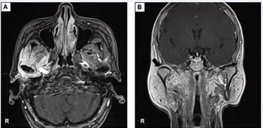 Figure 2 Magnetic resonance imaging (MRI) with contrast of the maxillofacial region. (A) The axial view showed peripheral enhancement signals of the right temporomandibular joint and surrounding muscles (white arrow). (B) The coronal view exhibited swollen inflammatory tissue around the mandibular condyle (black arrow).