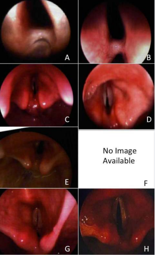 Figure 2: Kenalog Pre-injection and Post-injection Comparison Images (A) Patient 1: initial, stage I, (B) Patient 1: final showing improved/ stable, (C) Patient 2: initial, stage II, (D) Patient 2: final showing improved/resolved, (E) Patient 3: initial, stage III, (F) Patient 3: no image exists due to flexible fiberoptic laryngoscopy use for final exam which showed resolution of scar band, (G) Patient 4: initial, stage IV, (H) Patient 4: final showing improved/resolved.